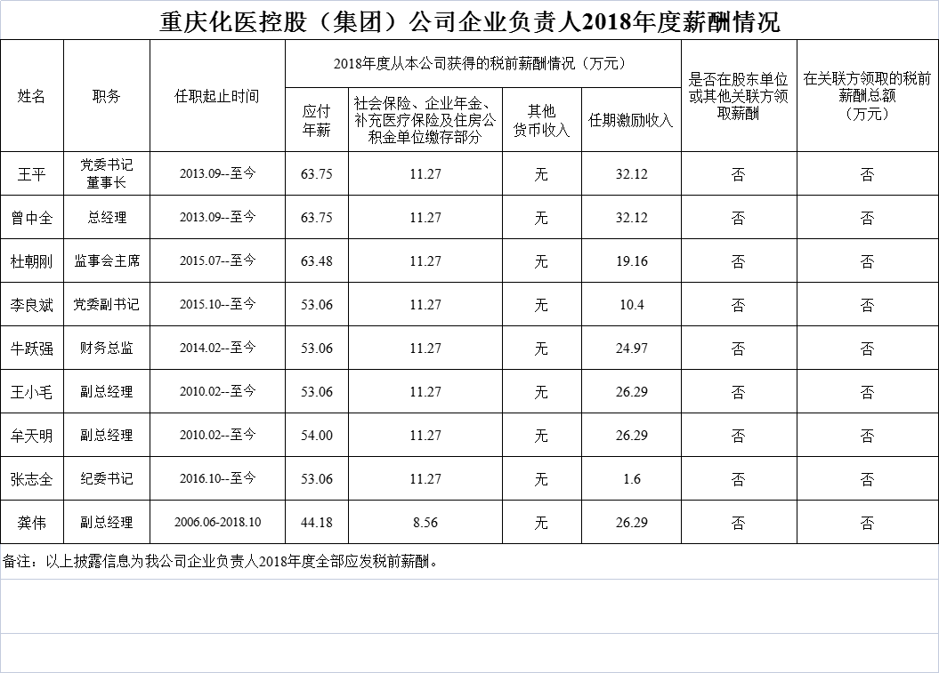 重慶化醫(yī)控股(集團)公司企業(yè)負責人2018年薪酬情況