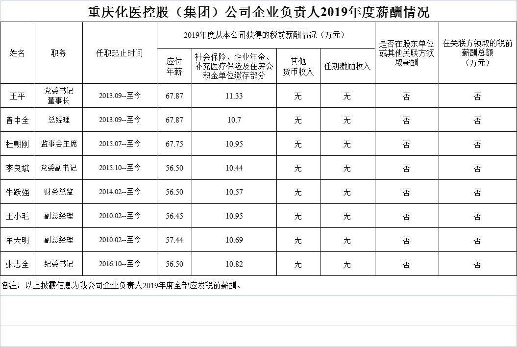 重慶化醫(yī)控股(集團(tuán))公司企業(yè)負(fù)責(zé)人2019年度薪酬情況