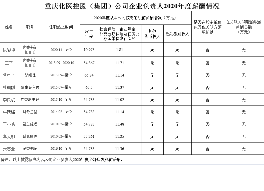 重慶化醫(yī)控股(集團(tuán))公司企業(yè)負(fù)責(zé)人2020年度薪酬情況