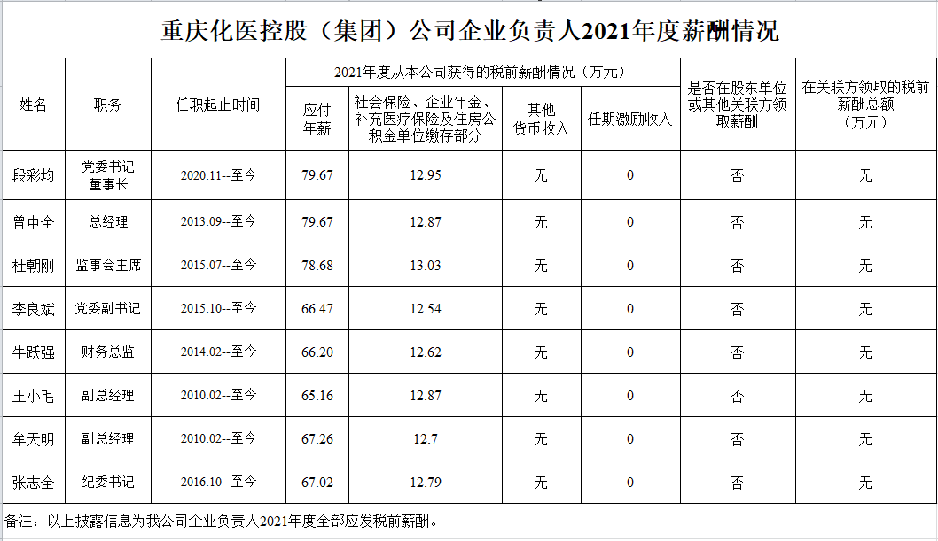 重慶化醫(yī)控股(集團(tuán))公司企業(yè)負(fù)責(zé)人2021年度薪酬情況